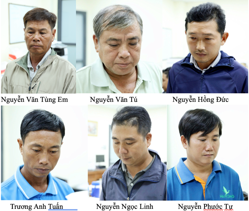 6 người bị khởi tố, bắt tạm giam gồm: Nguyễn Phước Tự (SN 1988, cư trú xã Thạnh Mỹ Tây, tỉnh An Giang); Nguyễn Văn Tú (SN 1975, cư trú xã Phú An, tỉnh An Giang); Nguyễn Hồng Đức (SN 1986, cư trú xã Vĩnh Hậu, tỉnh An Giang); Nguyễn Văn Tùng Em (sinh năm 1972) và Trương Anh Tuấn (sinh năm 1984, cùng cư trú xã Phú Tân, tỉnh An Giang); Nguyễn Ngọc Linh (sinh năm 1984, cư trú xã Bình Mỹ, tỉnh An Giang).