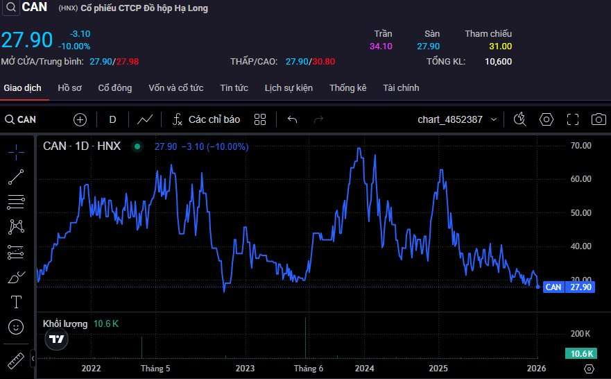 Giữa lúc thị trường chứng khoán khởi sắc, cổ phiếu CAN của CTCP Đồ hộp Hạ long lại ngược dòng giảm về mức giá sàn 27.900 đồng/cp ngay từ đầu phiên 8/1. Cú sụt giảm mạnh đẩy giá cổ phiếu lùi sâu về đáy hơn 3 năm diễn ra ngay sau khi những thông tin tiêu cực về vụ việc 120 tấn thịt lợn nhiễm bệnh bị phanh phui.