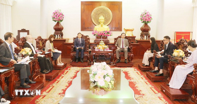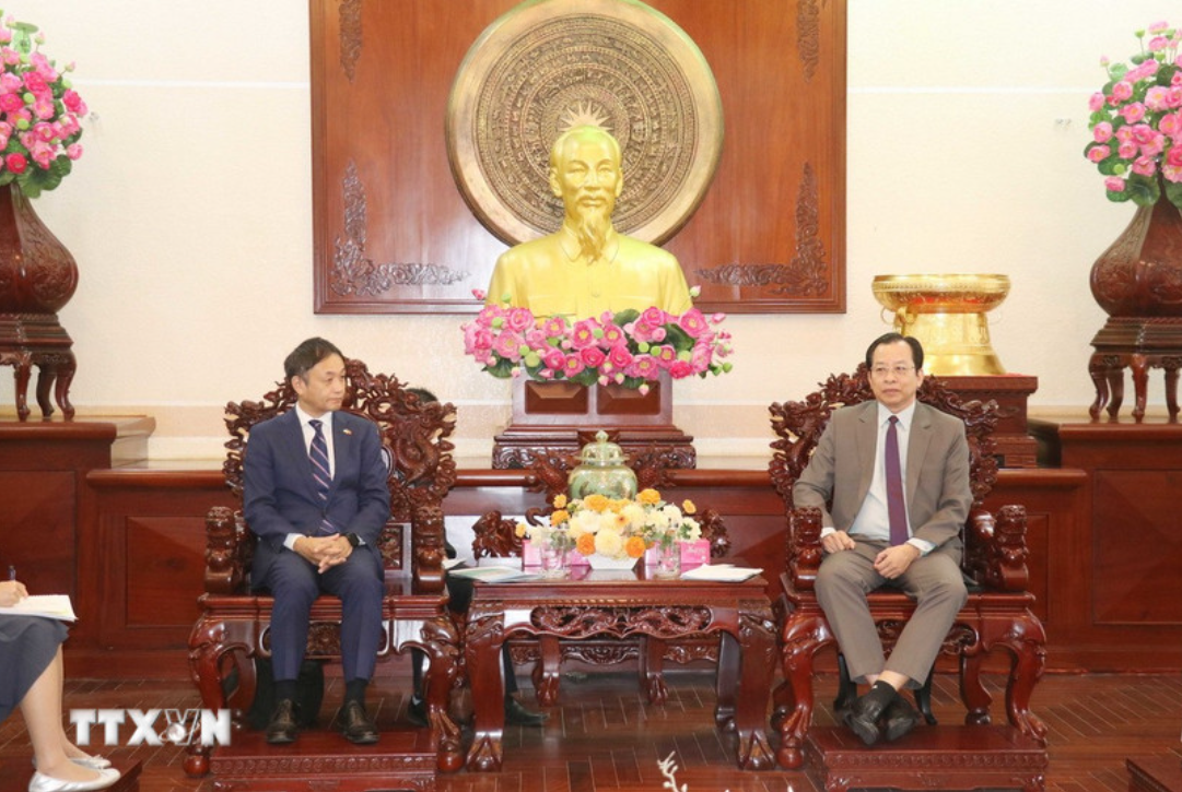 Ông Vương Quốc Nam (trái), Phó Chủ tịch Ủy ban Nhân dân thành phố Cần Thơ tiếp ông Okabe Mitsutoshi, Trưởng Văn phòng đại diện Tổ chức Xúc tiến Thương mại Nhật Bản (JETRO) tại Thành phố Hồ Chí Minh. (Ảnh: Ngọc Thiện/TTXVN)