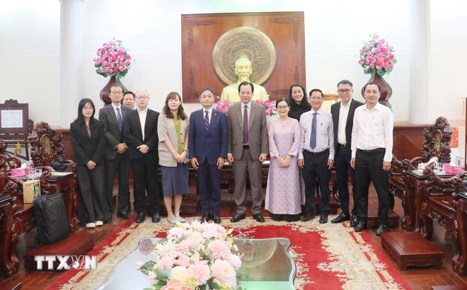 Lãnh đạo thành phố Cần Thơ và Văn phòng Đại diện Tổ chức Xúc tiến Thương mại Nhật Bản (JETRO) tại Thành phố Hồ Chí Minh tại buổi làm việc. (Ảnh: Ngọc Thiện/TTXVN)