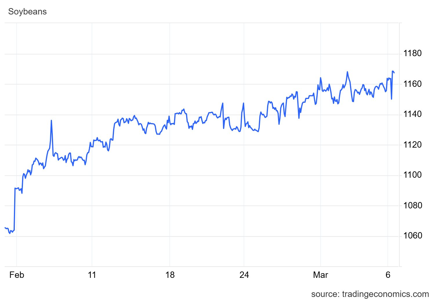 Giá dầu đậu nành cũng tăng theo đà đi lên của dầu thô, trong bối cảnh thị trường lo ngại nguồn cung năng lượng có thể bị gián đoạn do xung đột tại Iran và khu vực Trung Đông. Ngược lại, giá bột đậu nành chịu áp lực giảm do hoạt động giao dịch chênh lệch giá giữa các sản phẩm chế biến.