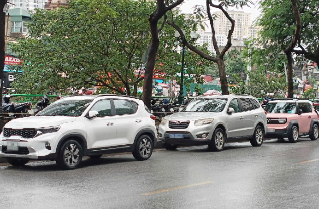 Một xe biển xanh đỗ phía ngoài đường trước tòa nhà.