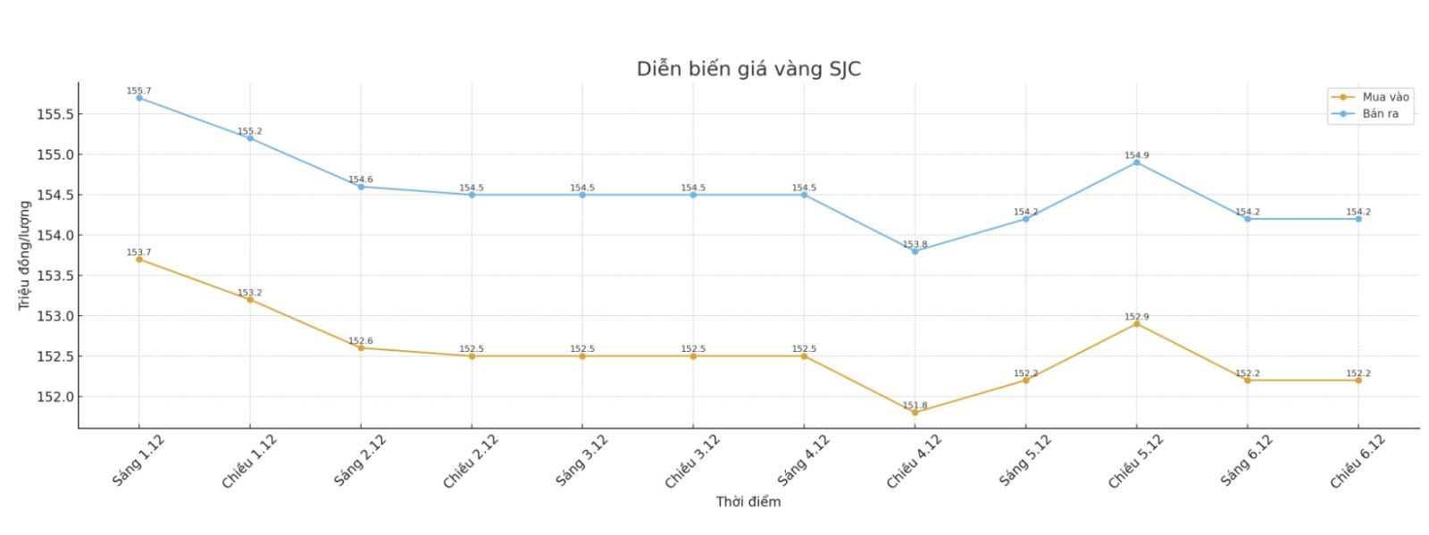 Giá vàng miếng SJC được Bảo Tín Minh Châu niêm yết ở ngưỡng 152,7-154,2 triệu đồng/lượng (mua vào - bán ra), giảm 300.000 đồng/lượng cả hai chiều. Chênh lệch giá mua vào - bán ra ở ngưỡng 1,5 triệu đồng/lượng.