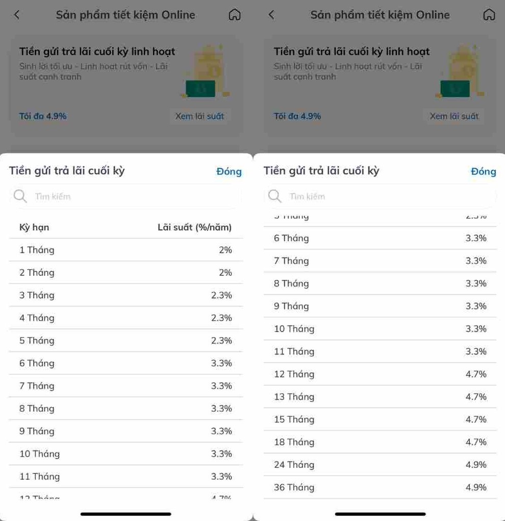 Lãi suất tiền gửi kỳ hạn 24-36 tháng ở mức 4,9%/năm.