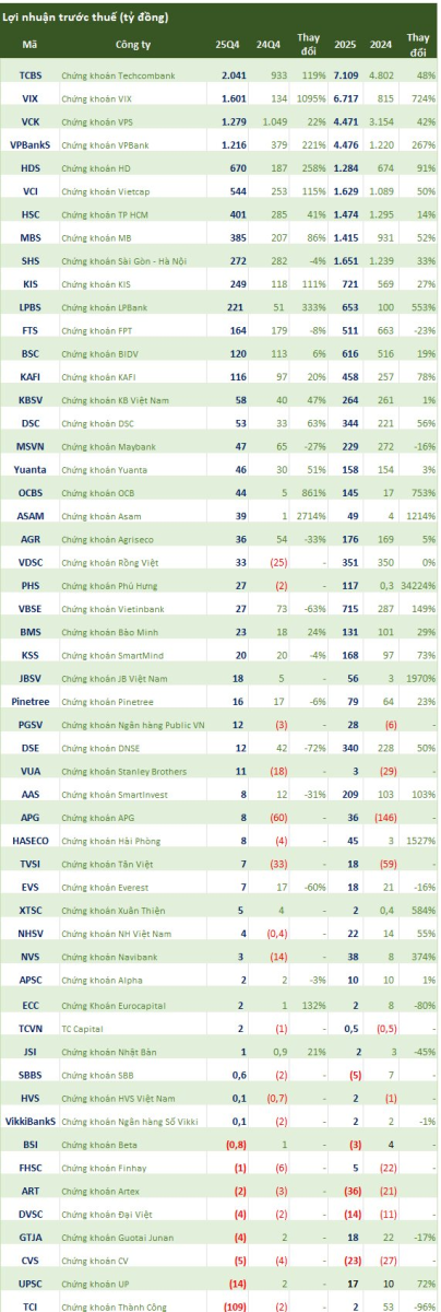 Nhiều CTCK thuộc hệ sinh thái ngân hàng ghi nhận kết quả kinh doanh tương đối tích cực. Chứng khoán LPBank lãi trước thuế 221 tỷ đồng trong quý 4, nâng mức LNTT cả năm 2025 lên 653 tỷ, gấp gần 7 lần năm 2024.
