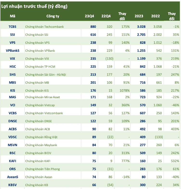 Nhóm lãi trăm tỷ trong quý 4/2023 còn có Chứng khoán Vietcombank (VCBS) với LNTT tăng trưởng 127% lên 127 tỷ đồng. Luỹ kế năm 2023, VCBS báo lãi trước thuế 607 tỷ đồng, tăng 143%. Bên cạnh đó, Chứng khoán DNSE ghi nhận LNTT quý 4 cao gấp đôi cùng kỳ, đạt 122 tỷ đồng. Cả năm 2023, DNSE lãi trước thuế 286 tỷ, tăng trưởng 201%.