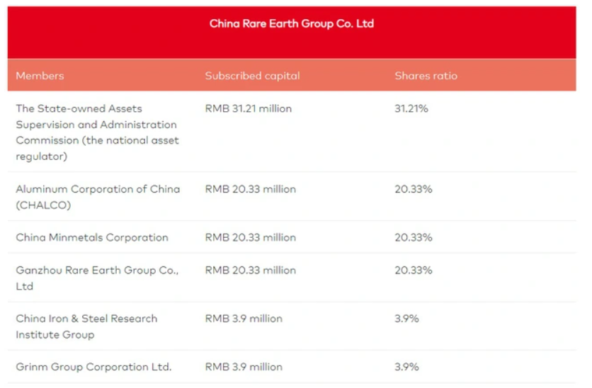 Về Tập đoàn Đất hiếm Trung Quốc, hiện có trụ sở tại tỉnh Giang Tây được thành lập vào tháng 12/2021. Đây là kết quả của sự sáp nhập ba trong số 6 doanh nghiệp 'thống trị' ngành đất hiếm của Trung Quốc bao gồm: Tập đoàn Nhôm Trung Quốc (CHALCO), Tập đoàn Minmetals Trung Quốc và Tập đoàn Ganzhou Rare Earth Group, mỗi công ty nắm giữ 20,3% cổ phần trong liên doanh mới.