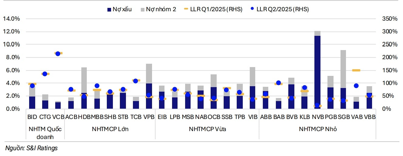 Tỷ lệ bao phủ nợ xấu (LLR) toàn ngành ổn định quanh 80% trong Quý 2/2025 – chưa có nhiều biến chuyển và vẫn thấp hơn giai đoạn 2021 – 2022. LLR có sự phân hóa rõ nét giữa các ngân hàng, nhóm NHTMCP quy mô nhỏ nhìn chung có bộ đệm dự phòng thấp hơn nhiều nhóm ngân hàng quốc doanh. Một số ngân hàng lớn MBB, SHB, VPB đã đẩy mạnh trích lập dự phòng trong bối cảnh chất lượng tài sản cải thiện và thu nhập hoạt động tăng trưởng tốt (MBB +22% YoY, SHB +135% YoY). Ngược lại, PGB và VAB lại giảm trích lập mặc dù nợ xấu tăng.