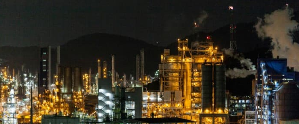 Toàn cảnh một nhà máy lọc dầu hoạt động vào ban đêm, nổi bật với hệ thống đèn chiếu sáng và ống khói thải.Ảnh: Oil Price