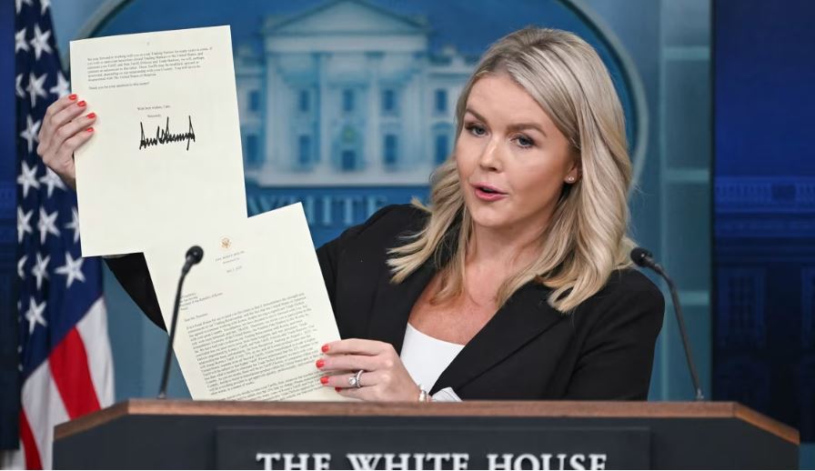 Thư ký báo chí Nhà Trắng Karoline Leavitt cầm một lá thư của Tổng thống Donald Trump gửi cho Tổng thống Hàn Quốc Lee Jae-myung hôm 7-7, thông báo về mức thuế quan đối ứng dự kiến có hiệu lực vào ngày 1-8. Ảnh: Getty Images
