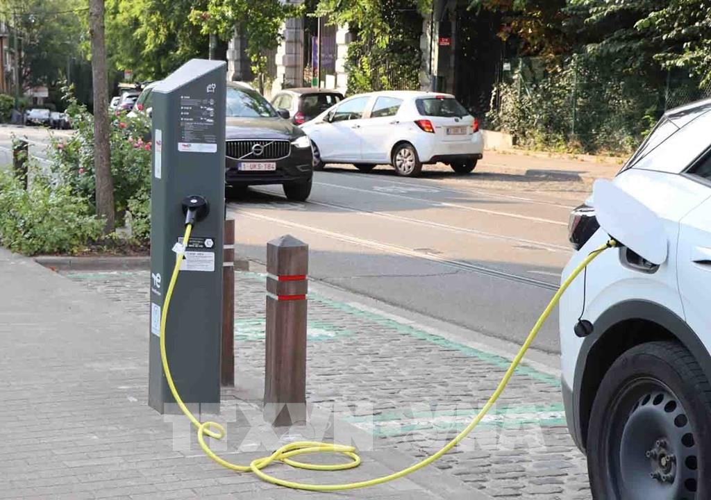 Một trạm sạc xe ô tô điện tại phố Dieweg, quận Uccle, Brussels (Bỉ). Ảnh: Hương Giang - PV TTXVN