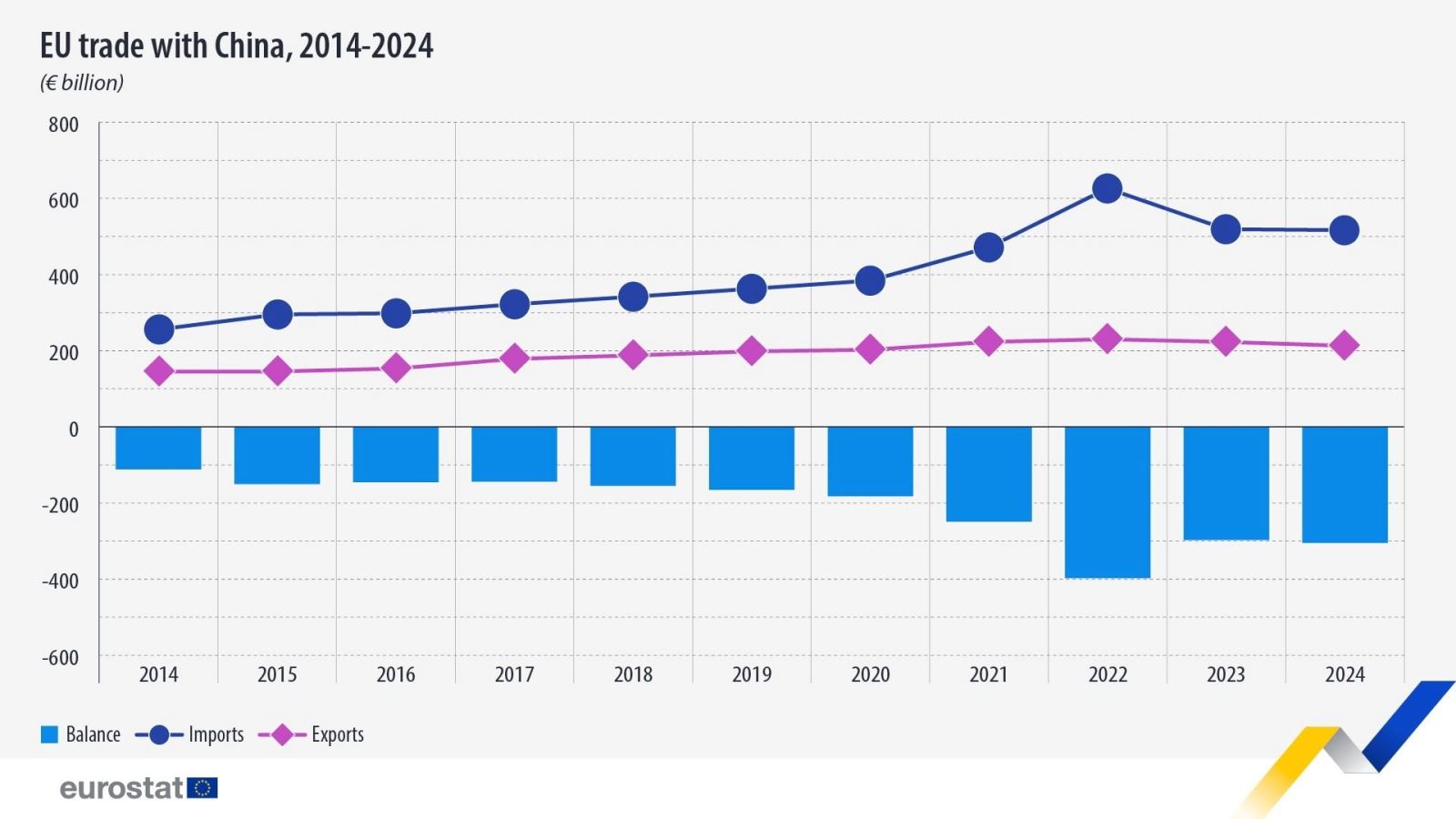 Kim ngạch xuất-nhập khẩu của EU với Trung Quốc từ 2014-2024. Nguồn: Eurostat.