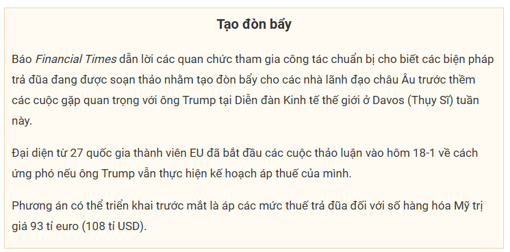 Theo báo New York Times, ngày càng nhiều quan chức và chuyên gia bên ngoài cho rằng châu Âu sẽ buộc phải đáp trả ông Trump bằng sức mạnh, cụ thể là trả đũa về thương mại.
