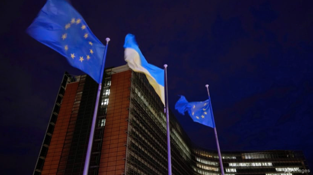 Cờ của Liên minh châu Âu (EU) và Ukraine trước trụ sở EU ngày 24/2. (Ảnh: AP)