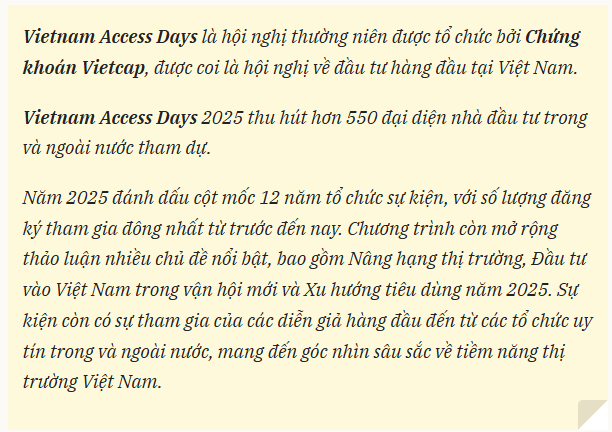 Năm nay, theo như thông tin được biết, Vietnam Access Days thu hút đông đảo nhà đầu tư trong và nước hơn nhiều lần so với các năm trước đây. Hy vọng số người tham gia sẽ tăng cùng với sự phát triển của nền kinh tế và thị trường Việt Nam trong những năm sắp tới.