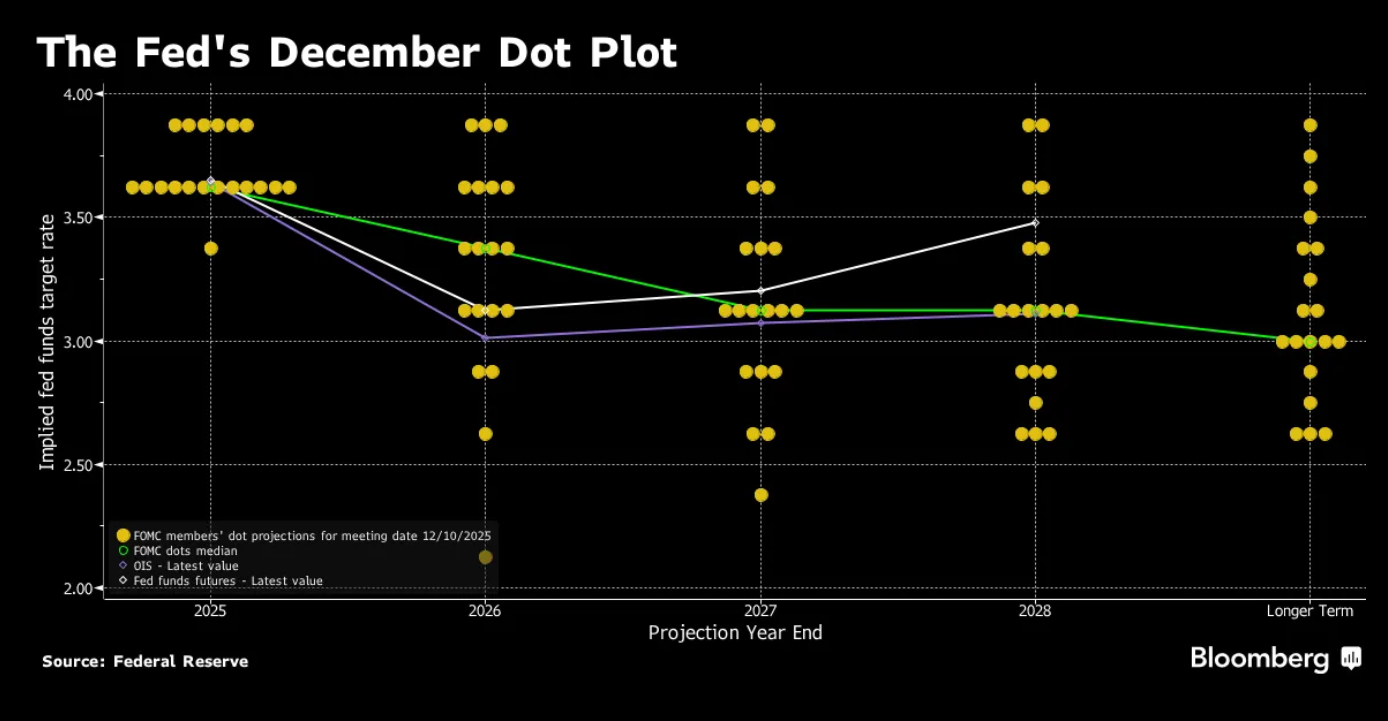 Dữ liệu của Bloomberg cho thấy có sự phân hóa mạnh trong các quan chức Fed về quan điểm lãi suất Mỹ năm 2026 (Ảnh: Bloomberg)