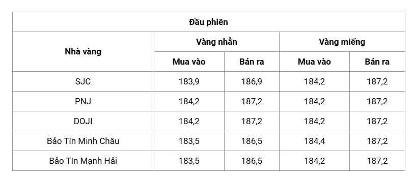 Cụ thể, vàng miếng tại SJC, PNJ và DOJI cùng được niêm yết ở mức 184,2 – 187,2 triệu đồng/lượng (mua vào – bán ra). Bảo Tín Minh Châu chào giá mua vào cao hơn ở mức 184,4 triệu đồng/lượng, trong khi giá bán ra vẫn giữ tại 187,2 triệu đồng/lượng. Bảo Tín Mạnh Hải niêm yết giá vàng miếng ở mức 184,2 – 187,2 triệu đồng/lượng, cho thấy mặt bằng giá tương đối đồng đều giữa các thương hiệu.
