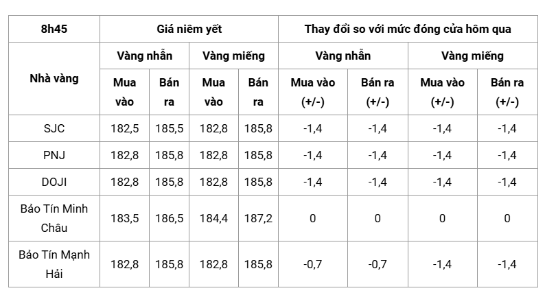 Cụ thể, vàng miếng tại SJC, PNJ và DOJI cùng được niêm yết ở mức 182,8 – 185,8 triệu đồng/lượng (mua vào – bán ra), giảm 1,4 triệu đồng/lượng ở cả hai chiều so với phiên trước. Bảo Tín Mạnh Hải cũng điều chỉnh vàng miếng về cùng vùng giá này, ghi nhận mức giảm tương tự.