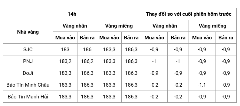 Cụ thể, vàng miếng tại SJC, PNJ và DOJI cùng chốt phiên ở mức 183,3 – 186,3 triệu đồng/lượng (mua vào – bán ra), giảm 0,9 triệu đồng/lượng ở cả hai chiều so với phiên trước. Bảo Tín Minh Châu niêm yết giá mua vào cao hơn nhẹ ở mức 183,5 triệu đồng/lượng, trong khi giá bán ra niêm yết tại 186,3 triệu đồng/lượng. Bảo Tín Mạnh Hải chốt phiên vàng miếng ở mức 183,3 – 186,3 triệu đồng/lượng, ghi nhận mức giảm tương tự.
