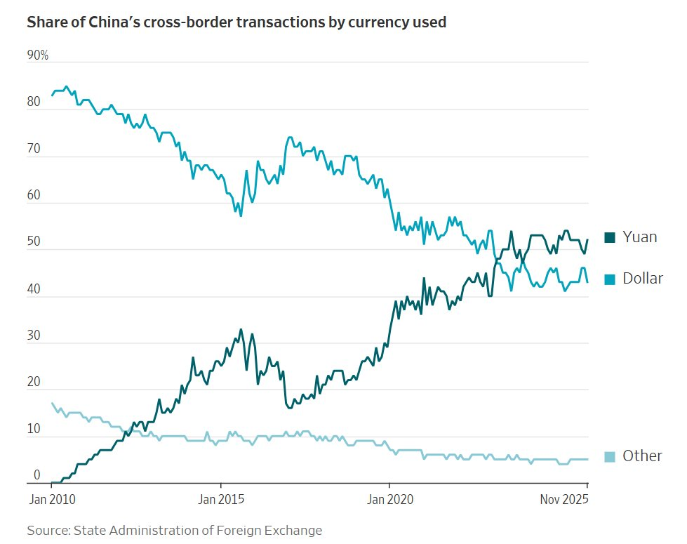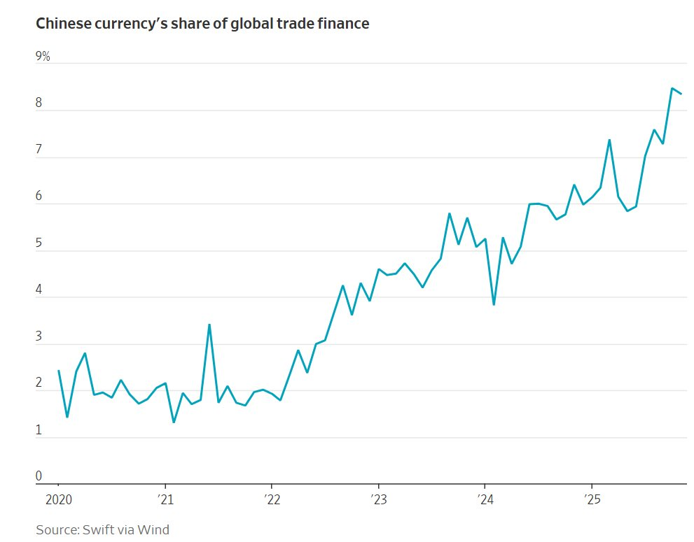 Theo ngân hàng trung ương Trung Quốc, tỷ lệ cho vay nước ngoài bằng nhân dân tệ của các tổ chức tài chính Trung Quốc đã tăng lên 45% trong tổng dư nợ 2.000 tỷ nhân dân tệ, tương đương khoảng 290 tỷ USD, vào cuối năm 2024. Một thập kỷ trước, tỷ lệ này dưới 10%, theo số liệu của Quỹ Tiền tệ Quốc tế (IMF).