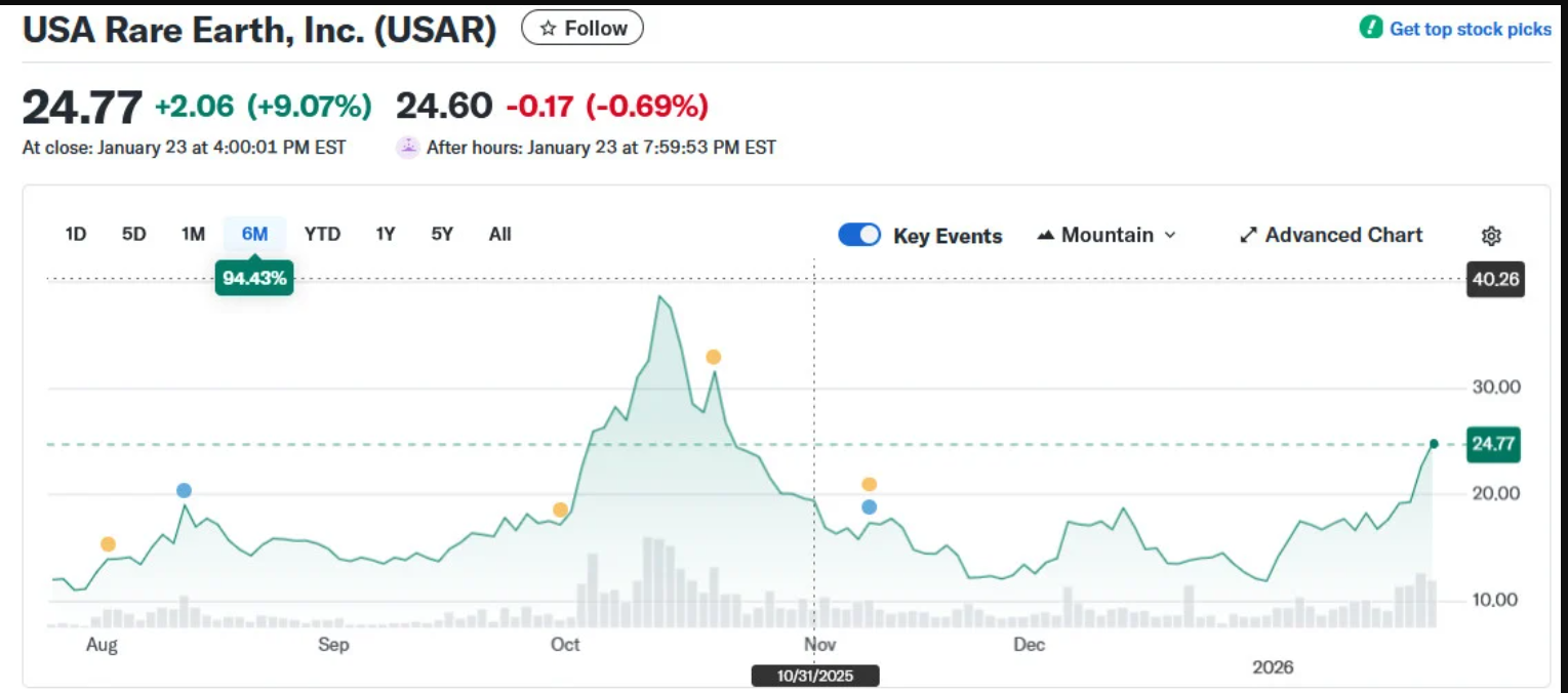 Diễn biến giá cổ phiếu USA Rare Earth trong 6 tháng qua. Ảnh: Yahoo Finance