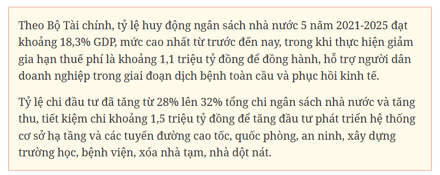 Duy trì ổn định vĩ mô, kiểm soát nợ công và lạm phát: Bên cạnh việc kích thích tăng trưởng, việc giữ vững các cân đối lớn của nền kinh tế vẫn là một ưu tiên chiến lược. Chính sách tài khóa đã được điều hành một cách thận trọng để kiềm chế lạm phát trong bối cảnh có nhiều áp lực về giá cả. Đặc biệt, kỷ luật tài khóa được duy trì chặt chẽ, thể hiện qua việc kiểm soát nợ công.
