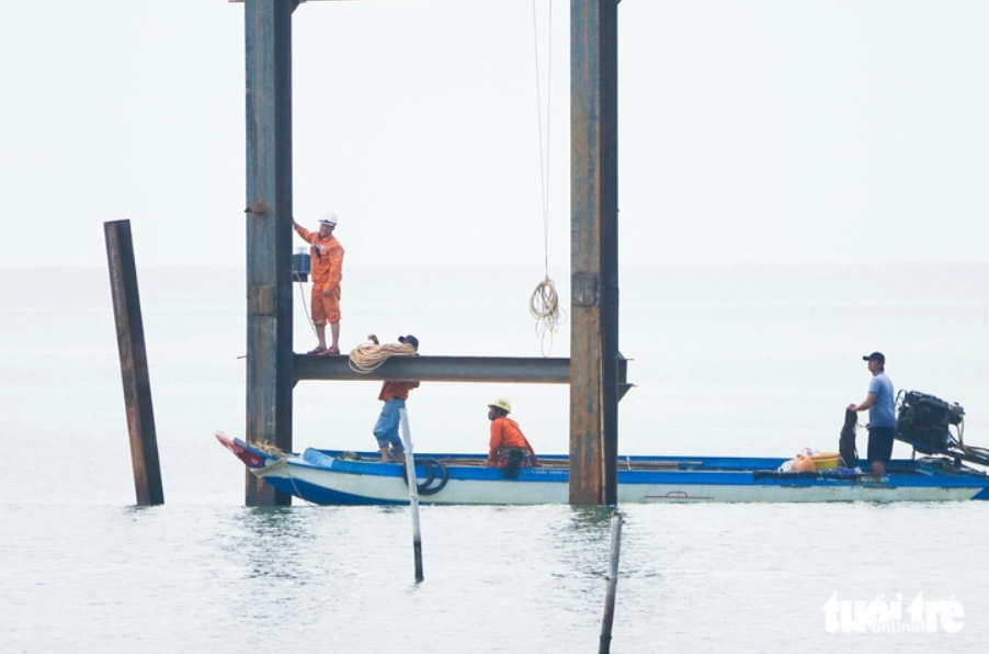Trưa 5-12, cán bộ kỹ thuật Điện lực An Giang vẫn miệt mài kéo dây nổi qua các trụ tạm trên biển để khắc phục sự cố cáp ngầm 110kV Hà Tiên - Phú Quốc - Ảnh: CHÍ CÔNG