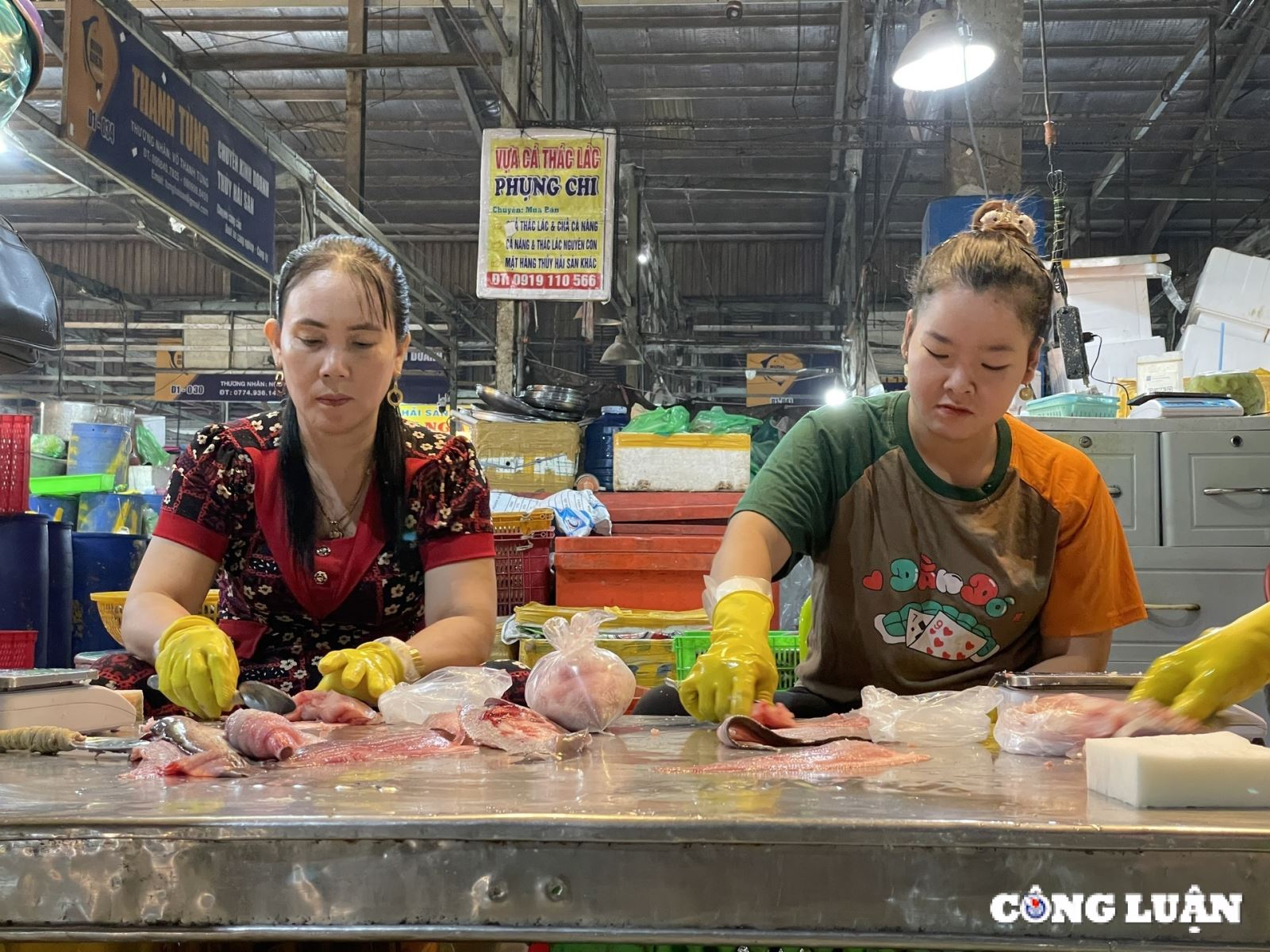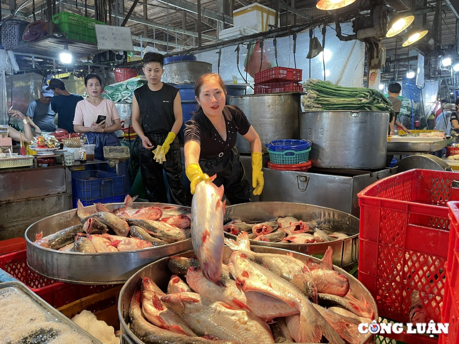 Từ đêm, cá thát lát sống được đưa về chợ, sau đó được các nhân viên phân nhóm nạo để kịp giao cho bạn hàng vào sáng sớm