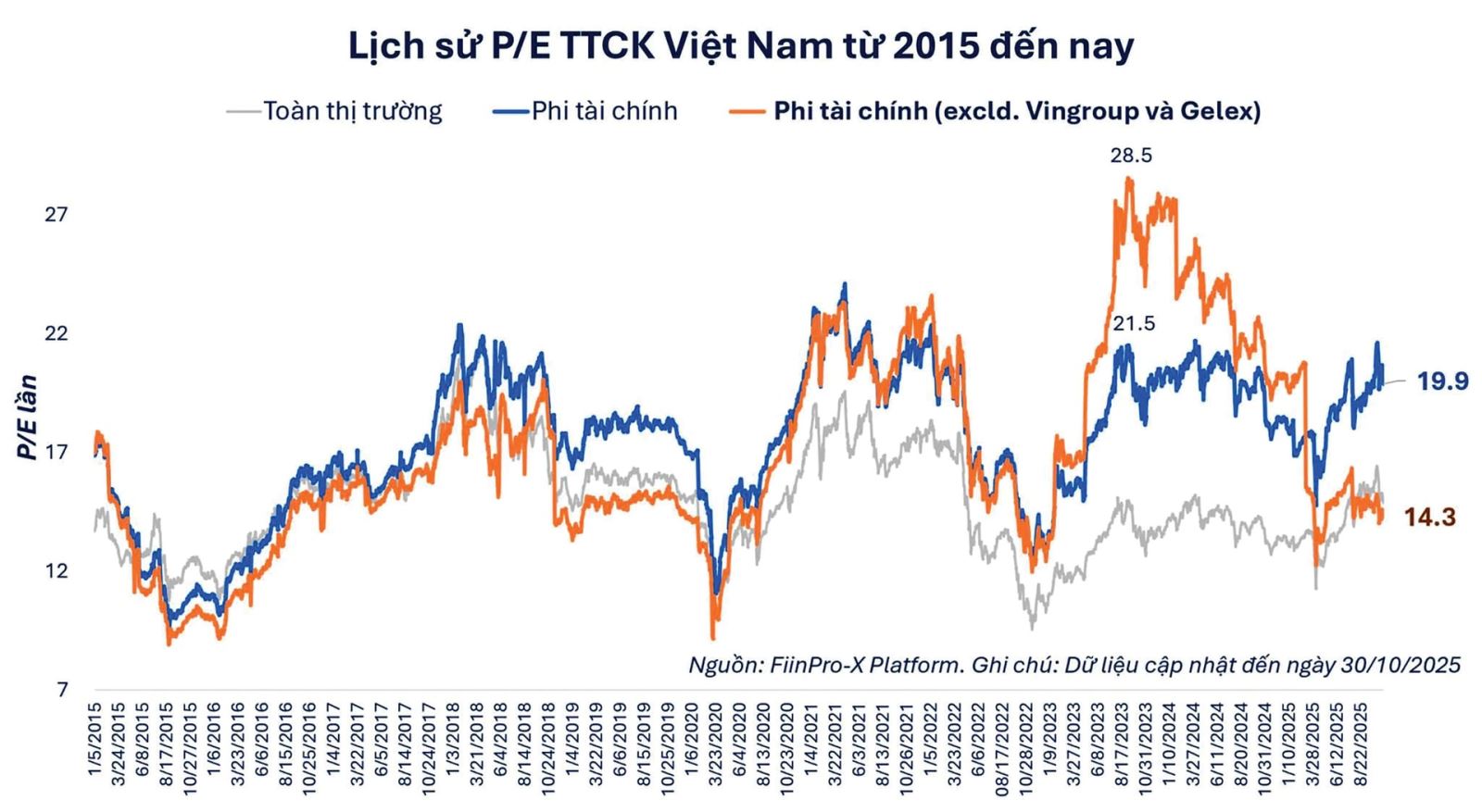 Tại Mỹ, tính đến cuối tháng 10, P/E forward của S&P 500 ở vùng cao lịch sử, hơn 22 lần, chủ yếu do nhóm công nghệ lớn kéo lên (Mag7 có P/E forward trên 30 lần). Trong khi đó, P/E của nhóm vốn hóa trung bình và nhỏ chỉ giao dịch quanh 15–16 lần, mức tương đối thấp trong 25 năm trở lại đây. Tại Việt Nam, theo ước tính của FiinGroup, nếu loại trừ ảnh hưởng của Vingroup và Gelex, định giá P/E trượt của nhóm phi tài chính chỉ ở mức 14,3 lần – vùng thấp kể từ 2015 đến nay.