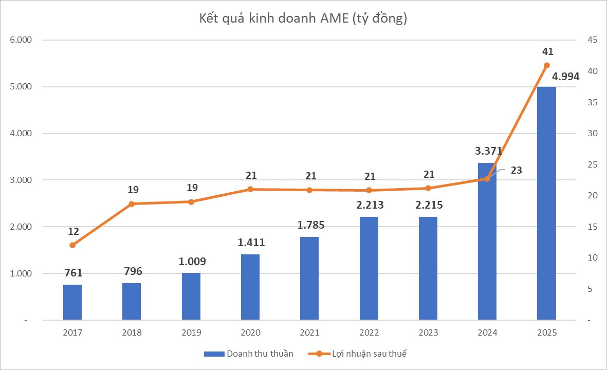 Kết thúc năm tài chính 2025, AME ghi nhận mức doanh thu thuần kỷ lục 4.994 tỷ đồng, tăng trưởng gần 48% so với mức 3.371 tỷ đồng của năm trước. Nhờ giá vốn hàng bán được kiểm soát, lợi nhuận gộp của công ty đạt hơn 236 tỷ đồng, cải thiện mạnh so với con số 149 tỷ đồng cùng kỳ. Sau khi khấu trừ các loại chi phí, Alphanam E&C báo lãi sau thuế xấp xỉ 41 tỷ đồng, tăng gần gấp đôi so với năm 2024.
