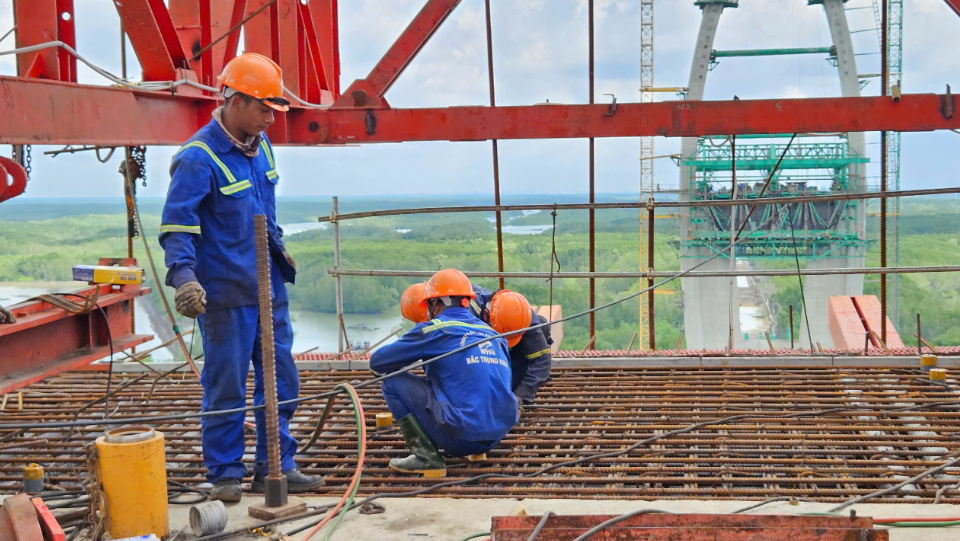 Báo cáo trước đoàn kiểm tra, đại diện Ban QLDA Giao thông khu vực và chuyên ngành nông nghiệp cho biết, dự án này được chia thành 5 gói thầu chính, tiến độ tổng thể đang được kiểm soát tốt, đảm bảo theo kế hoạch. Ở gói thầu số 38 và 39, công nhân đang đẩy nhanh lắp dầm, thi công tháp cầu. Tới nay, nhiều tháp trụ cầu chính đã vươn mình ra giữa sông. Tổng sản lượng hai gói thầu đã đạt hơn 53%.