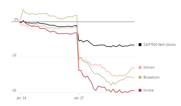 Thông tin này đã khiến Phố Wall rơi vào cảnh hỗn loạn. Cổ phiếu của Nvidia giảm 17% xuống mức thấp nhất kể từ tháng 10, trong khi các nhà sản xuất chip khác như Broadcom và Micron Technology giảm hơn 10%. Lĩnh vực công nghệ của chỉ số S&P 500 giảm 5,6%, đánh dấu mức giảm trong một ngày tồi tệ nhất trong hơn bốn năm. Tổng cộng, theo dữ liệu của Dow Jones Market Data, đợt bán tháo hôm thứ hai đã làm bốc hơi khoảng 1 nghìn tỷ USD giá trị thị trường.