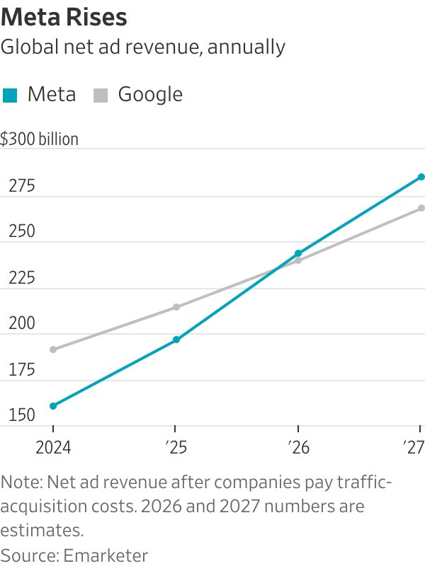 Tờ Wall Street Journal (WSJ) cho hay công ty nghiên cứu quảng cáo Emarketer dự báo rằng Meta sẽ vượt qua Google về doanh thu quảng cáo ròng trong năm nay với con số hơn 243,46 tỷ USD, nhỉnh hơn con số 239,54 tỷ USD của Google.