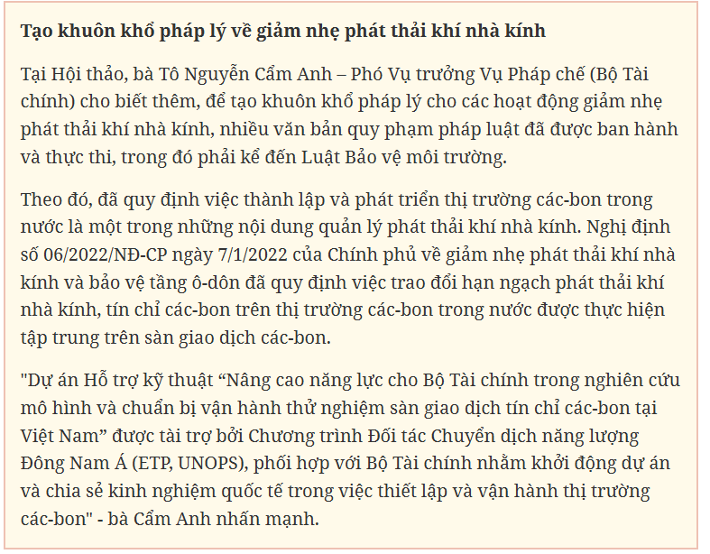 Phát biểu tại Hội thảo, bà Tô Nguyễn Cẩm Anh – Phó Vụ trưởng Vụ Pháp chế (Bộ Tài chính) cho biết, Việt Nam là một trong các quốc gia chịu nhiều tác động bất lợi của biến đổi khí hậu. Điều này đe dọa nghiêm trọng đến tăng trưởng kinh tế và phúc lợi xã hội. Trước thực tế đó, việc triển khai các biện pháp, công cụ chính sách nhằm giảm nhẹ phát thải khí nhà kính, bao gồm việc phát triển thị trường các-bon trong nước đã được Đảng và Nhà nước quan tâm từ sớm.