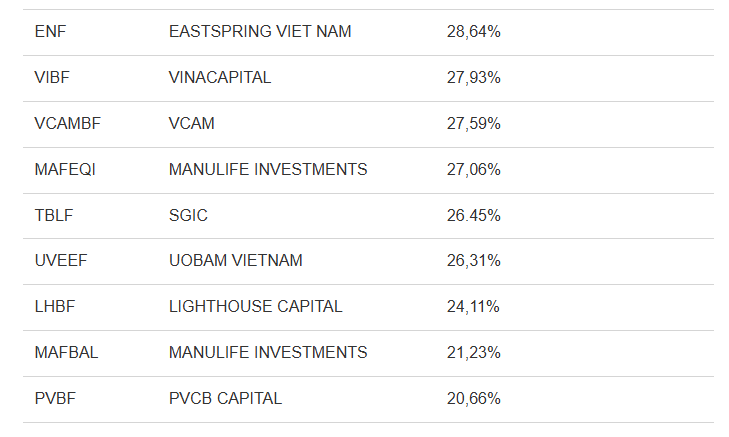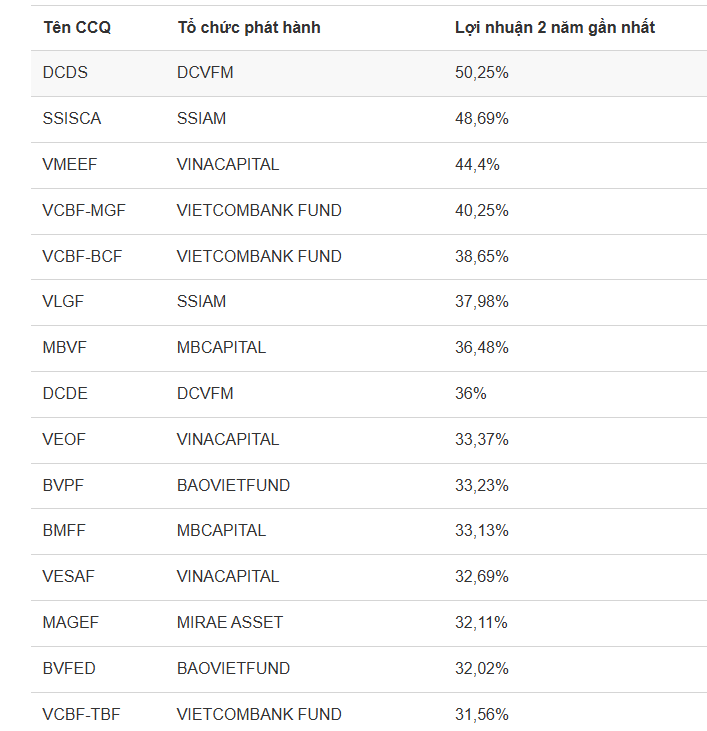 Số liệu cho thấy, nhiều quỹ mở đạt lợi suất ấn tượng trong 2 năm trở lại đây như DCDS, (+50,25%), SSI-SCA (+48,69%), VMEEF (+44,4%), VCBF-MGF (+40,25%), VCBF-BCF (+38,65%)…
