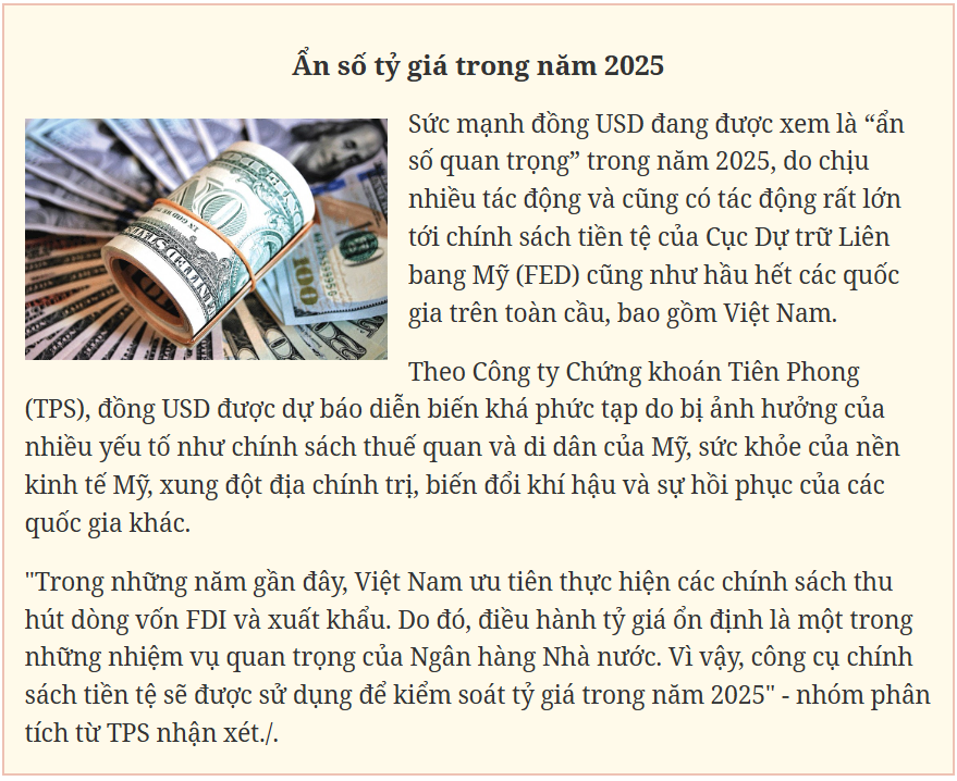 Ở chiều ngược lại, theo chuyên gia MBS, lạm phát năm 2025 không phải là mối lo, phần nào tạo dư địa cho Ngân hàng Nhà nước trong việc điều hành. Những biến số trên thị trường quốc tế, như chính sách điều hành Trump 2.0, ẩn số phục hồi của kinh tế Trung Quốc, hay chu kỳ nới lỏng tiền tệ có thể tạo ra cả cơ hội và thách thức cho Việt Nam.