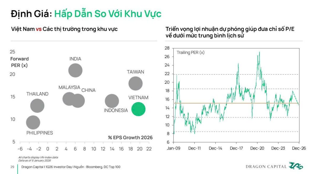 Theo ông Tuấn của Dragon Capital, dự kiến năm 2026, con số tăng trưởng cơ sở của thị trường sẽ mở rộng hơn, tức sẽ có số lượng cổ phiếu lớn hơn được định giá lại. “Điều này có nghĩa là thị trường có lẽ sẽ “dễ thở” hơn cho các nhà quản lý quỹ như chúng tôi, và cũng là một thị trường có khả năng kiếm được tiền”, ông Tuấn chia sẻ tại hội nghị nhà đầu tư của Dragon Capital diễn ra mới đây.