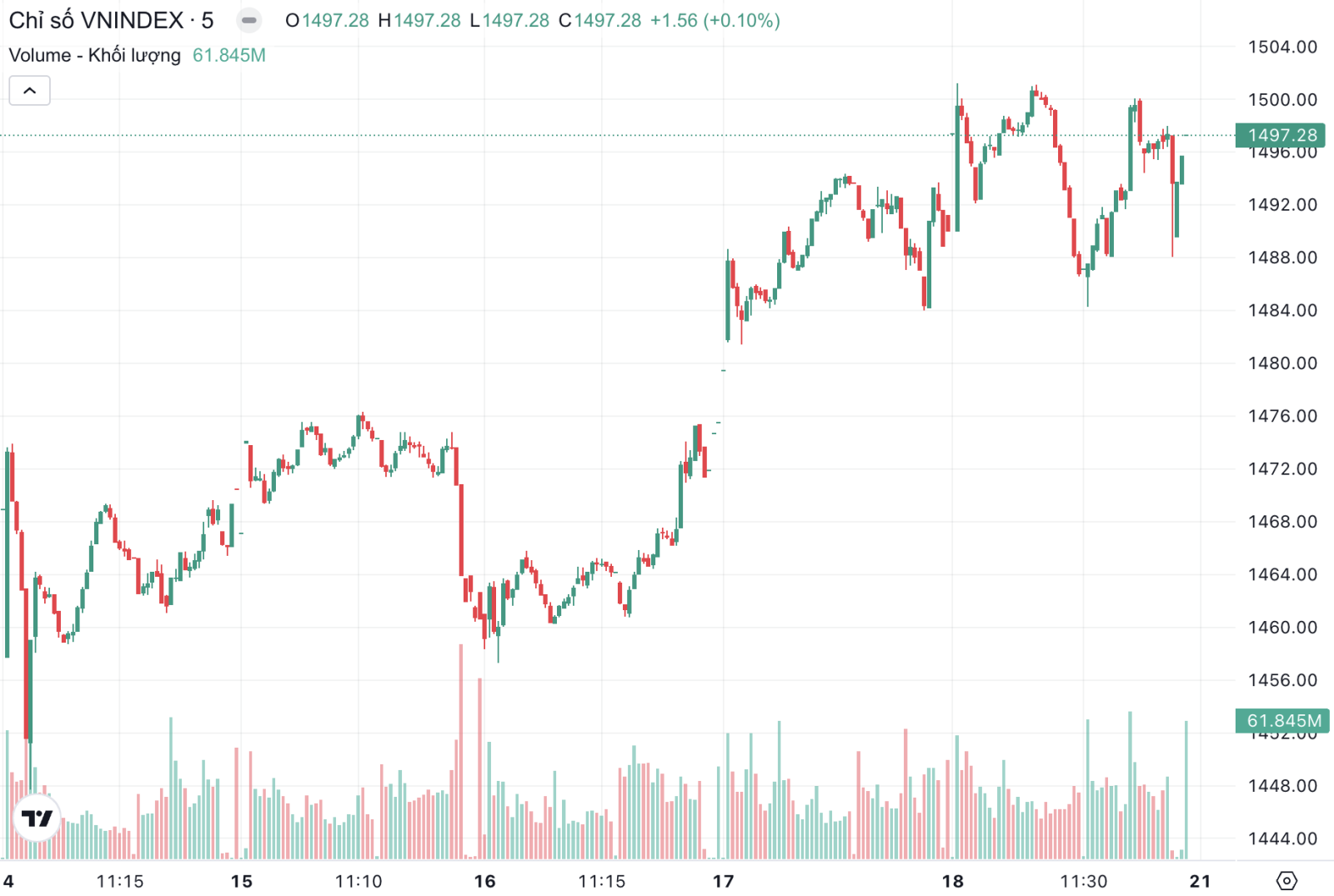Diễn biến chỉ số VN-Index trong 5 phiên gần đây (Nguồn: TradingView).