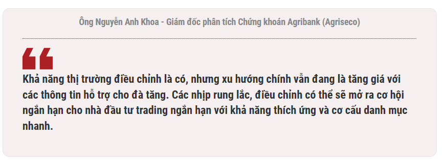 "Việc thị trường gặp áp lực bán gia tăng khi đang gần vùng đỉnh chỉ số trong lịch sử là điều hoàn toàn bình thường. Khả năng thị trường điều chỉnh là có, nhưng xu hướng chính vẫn đang là tăng giá với các thông tin hỗ trợ cho đà tăng. Các nhịp rung lắc, điều chỉnh có thể sẽ mở ra cơ hội ngắn hạn cho nhà đầu tư trading ngắn hạn với khả năng thích ứng và cơ cấu danh mục nhanh", ông Khoa nhận định.