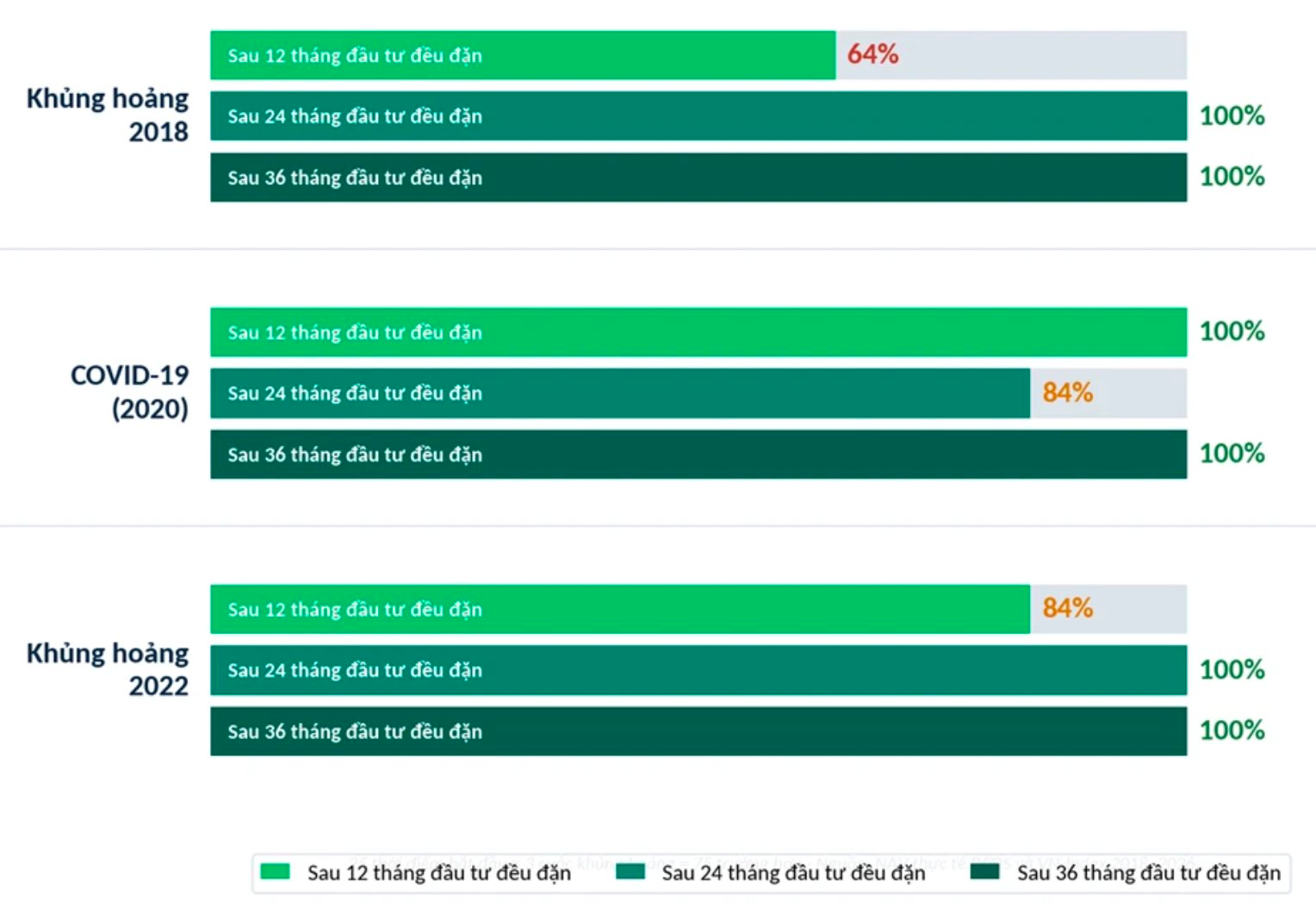 Kịch bản trong giai đoạn Covid-19 lại hoàn toàn khác. VN-Index giảm tới 45% chỉ trong sáu tuần – mức giảm nhanh và mạnh nhất trong lịch sử thị trường Việt Nam trước khi phục hồi mạnh mẽ và lập đỉnh mới trong vòng khoảng 18 tháng. Đáng chú ý, những nhà đầu tư bắt đầu DCA từ ba đến sáu tháng trước khi thị trường chạm đáy, khi tin tức vẫn rất tiêu cực, lại đạt kết quả tốt hơn so với những người bắt đầu đúng thời điểm đáy. Nguyên nhân là họ đã tích lũy được nhiều chứng chỉ quỹ hơn ở vùng giá thấp trong suốt giai đoạn giảm. Khi thị trường đảo chiều, lượng tài sản này giúp họ hưởng trọn đà phục hồi. Sau 12 tháng, toàn bộ các trường hợp đều có hiệu quả vượt VN-Index và sau 24 tháng, tỷ lệ này đạt 84%.