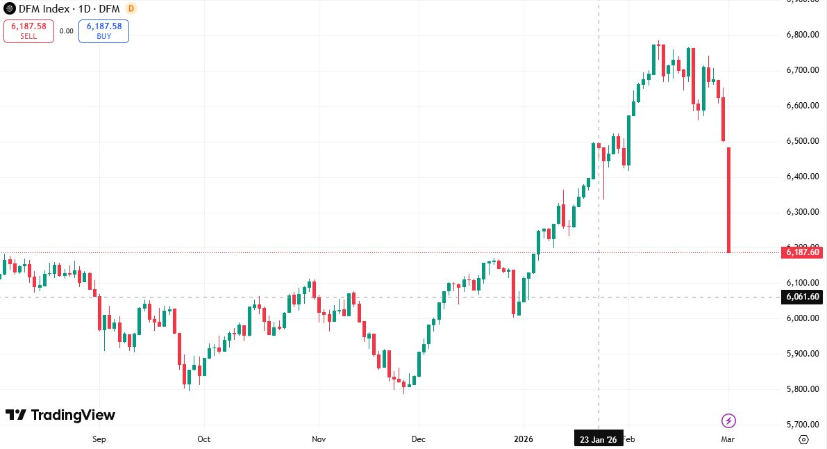 Theo ghi nhận, ngay từ khi mở cửa, chỉ số chứng khoán chính của Dubai (DFMGI) đã giảm mạnh 4,8%, ghi nhận mức giảm trong ngày lớn nhất kể từ tháng 5/ 2022. Sắc đỏ dàn trải trên diện rộng, dẫn đầu là nhà phát triển bất động sản hàng đầu Emaar Properties bốc hơi 4,9%, trong khi hãng hàng không giá rẻ Air Arabia (AIRA.DU) giảm 5%.