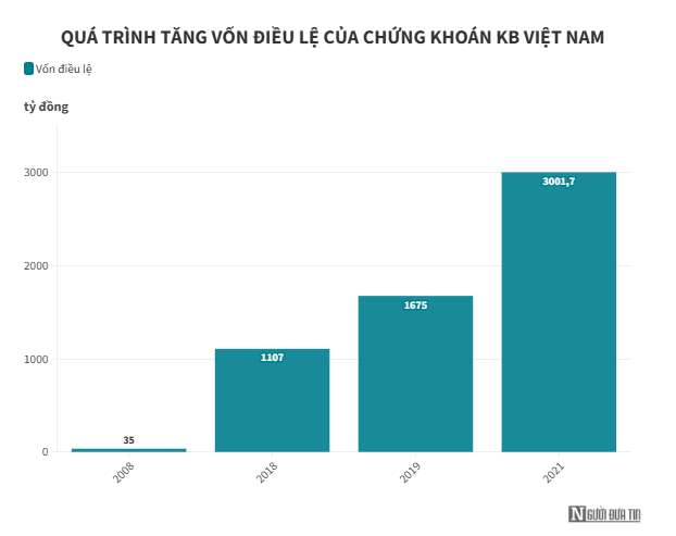 Sau một thập kỷ hoạt động, phải đến năm 2018 khi có sự xuất hiện của Chứng khoán KB Hàn Quốc, thì Chứng khoán KB Việt Nam mới lần đầu tăng vốn điều lệ lên hơn 1.107 tỷ đồng.