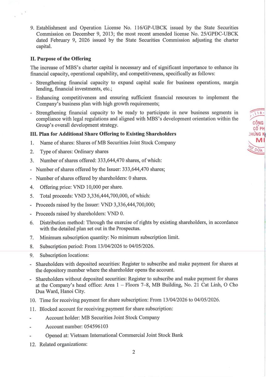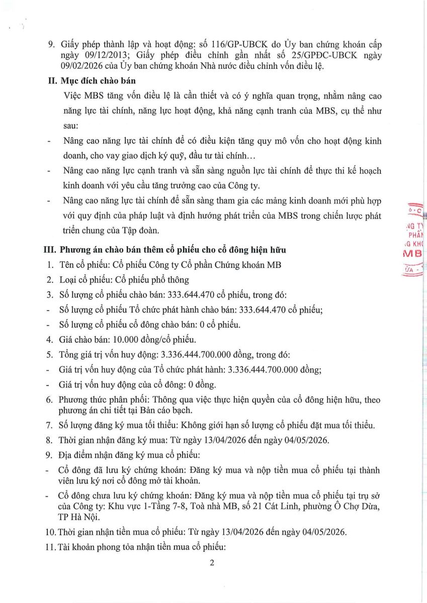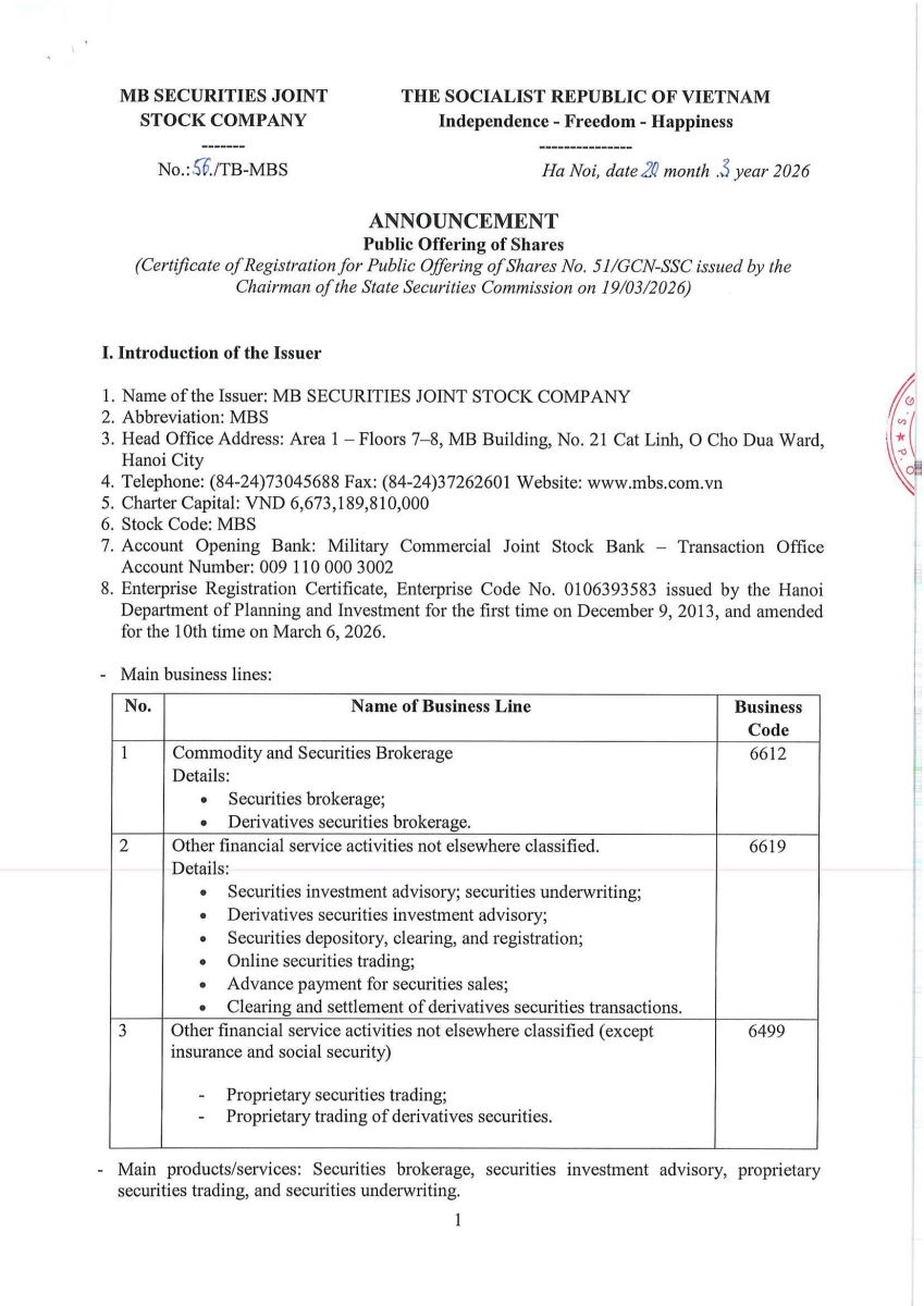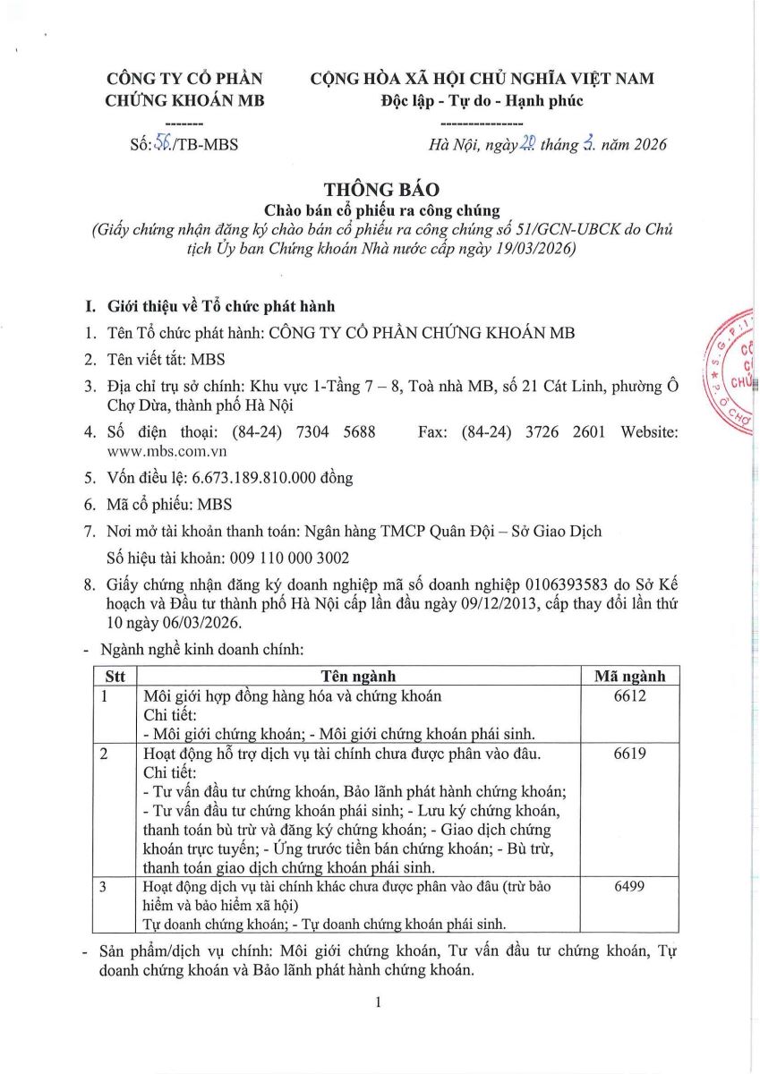 Công ty cổ phần Chứng khoán MB (MBS) có Thông báo chào bán cổ phiếu ra công chúng.