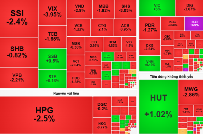 Sang phiên chiều, VN-Index tiếp tục giằng co trong nửa đầu phiên, nhưng áp lực bán gia tăng vào nửa cuối phiên khiến chỉ số suy yếu, có thời điểm giảm về gần mốc 1.660 điểm. Sắc đỏ chiếm ưu thế với 201 mã giảm so với 119 mã tăng. Dù vậy, các cổ phiếu vốn hóa lớn như VIC (tăng gần trần), VNM, và FPT vẫn là điểm sáng, giúp hạn chế đà giảm của chỉ số.