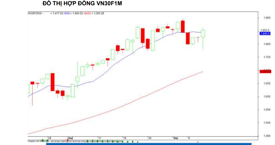 Hợp đồng tháng VN30F2509 đóng cửa tại 1.853,5 điểm, tăng +28,7 điểm so với phiên trước. Mức tăng của hợp đồng này lớn hơn mức tăng của chỉ số cơ sở, nên khoảng cách chênh lệch thu hẹp ở trạng thái âm với mức -1,58 điểm.