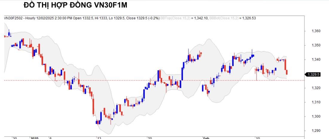 Trên đồ thị kỹ thuật, hợp đồng VN30F2502 điều chỉnh giảm trở lại từ vùng cản kỹ thuật 1.340 nơi hội tụ của Gap giảm phiên 10/02/2025 và đỉnh cũ. Tuy nhiên, để xác nhận sóng tăng kết thúc thì giá cần phải phá vỡ hỗ trợ gần 1.325 điểm để phụ định các mẫu hình tích lũy tăng hiện tại. Do đó, hành động giá sẽ xác nhận xu hướng rõ ràng trong các phiên tới.