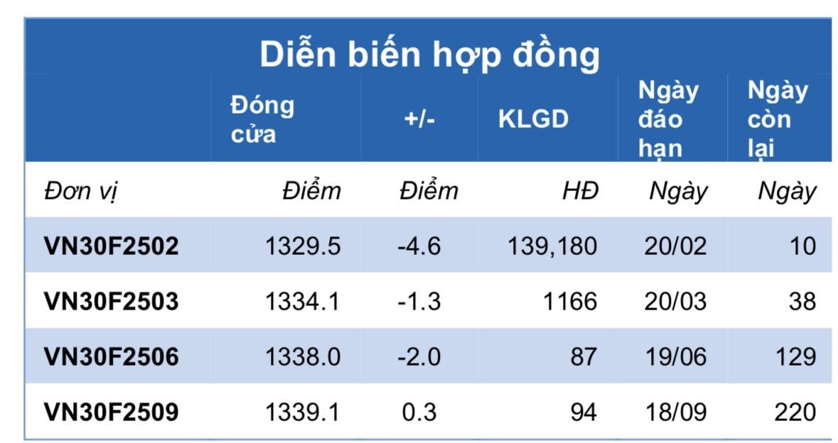 Hợp đồng tháng hiện tại VN30F2502 đóng cửa tại 1.329,6 điểm, giảm -4,6 điểm so với phiên kế trước. Mức giảm của hợp đồng này lớn hơn mức giảm của chỉ số cơ sở nên khoảng cách chênh lệch âm tiếp tục nới rộng với -6,2 điểm.