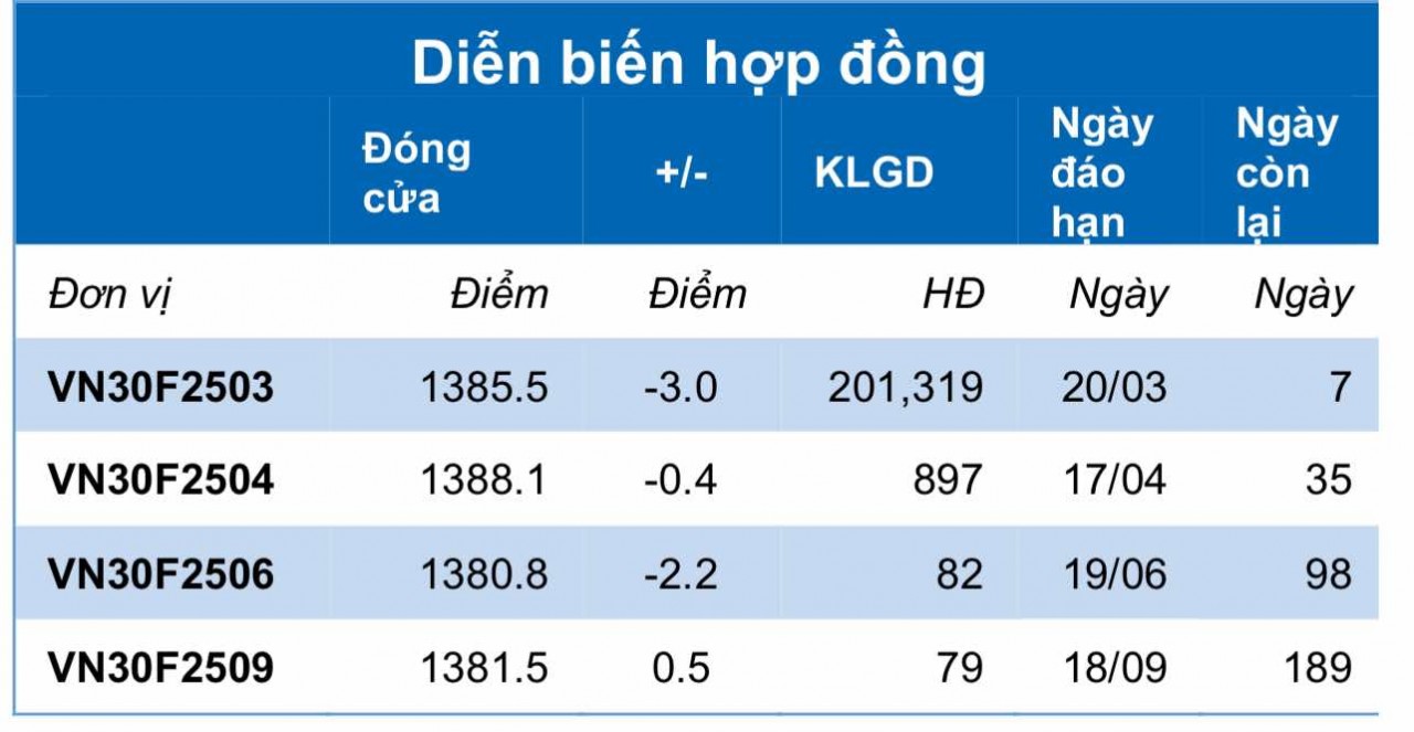 Hợp đồng tháng hiện tại VN30F2503 đóng cửa tại 1.385,5 điểm, giảm -3 điểm so với phiên kế trước. Mức giảm của hợp đồng này ít hơn mức giảm của chỉ số cơ sở đi ngang nên khoảng cách chênh lệch âm tiếp tục thu hẹp với -1,8 điểm.