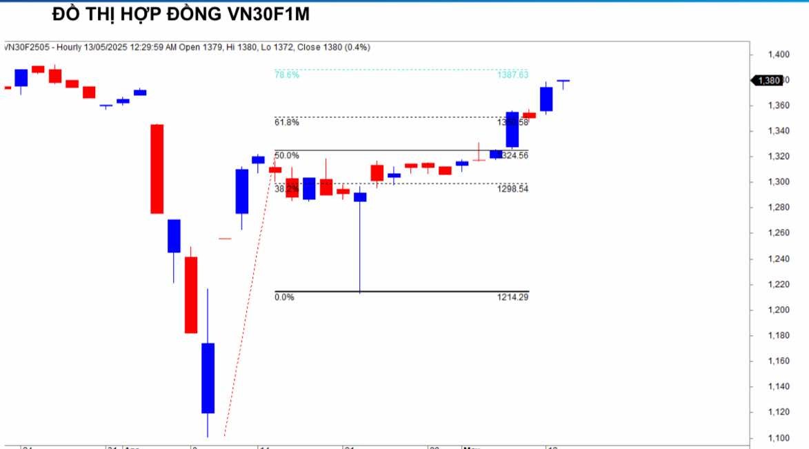Trên biểu đồ kỹ thuật khung 1 giờ, VN30F2505 tiếp tục quán tính tăng trong phiên hôm nay. Ở khung 1 giờ, vùng 1.387 điểm đang là kháng cự gần nhất. Cấu trúc tăng giá vẫn chưa hoàn thành với các nhịp điều chỉnh kỹ thuật sẽ được hỗ trợ tại 1.362-1.368 điểm.