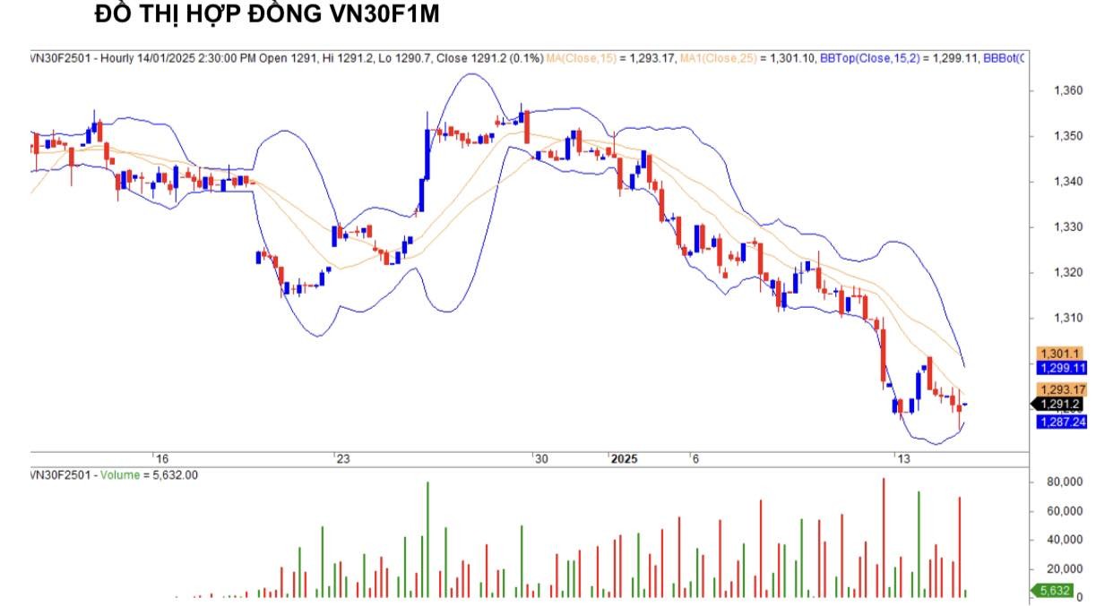 Riêng hợp đồng tháng hiện tại VN30F2501 đóng cửa tại 1.291,2 điểm, giảm -8,3 điểm so với phiên kế trước. Mức giảm của hợp đồng này ít hơn mức giảm của chỉ số cơ sở nên khoảng cách chênh lệch gia tăng với mức dương +1,97 điểm.